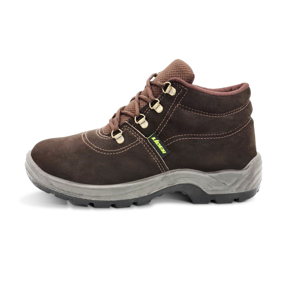 Botina de segurança em couro nobuck, com fechamento em cadarço, com biqueira de segurança e solado bidensidade injetado direto ao cabedal.