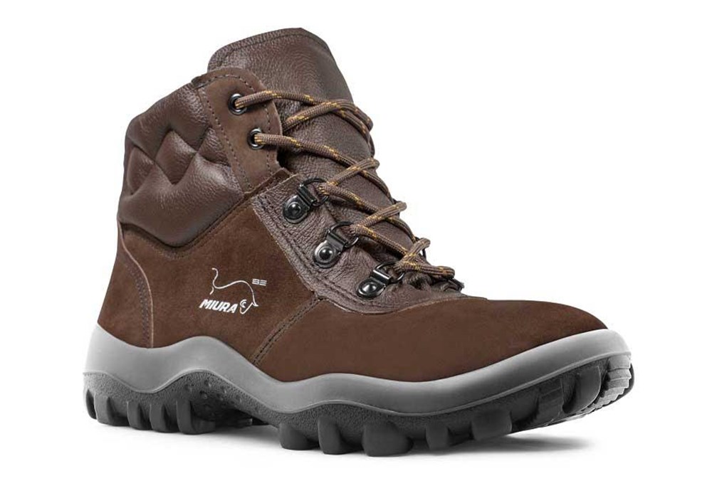 A Botina Miura fabricada em Nobuck Café é confeccionada em vaqueta nobuck na cor café. Para fabricar o Nobuck é utilizada a parte da flor do couro (a parte mais nobre). É lixado até adquirir um tom opaco, aveludado e suave, com pelos curtos, praticamente imperceptíveis. A linha Miura é muito famosa por oferecer um design diferenciado e grande conforto ao usuário. O nobuck utilizado tem tratamento hidrofugado e hidrorepelente, o que proporciona uma certa resistência à água (não é aconselhável a utilização deste tipo de couro para trabalhos intensos com água).