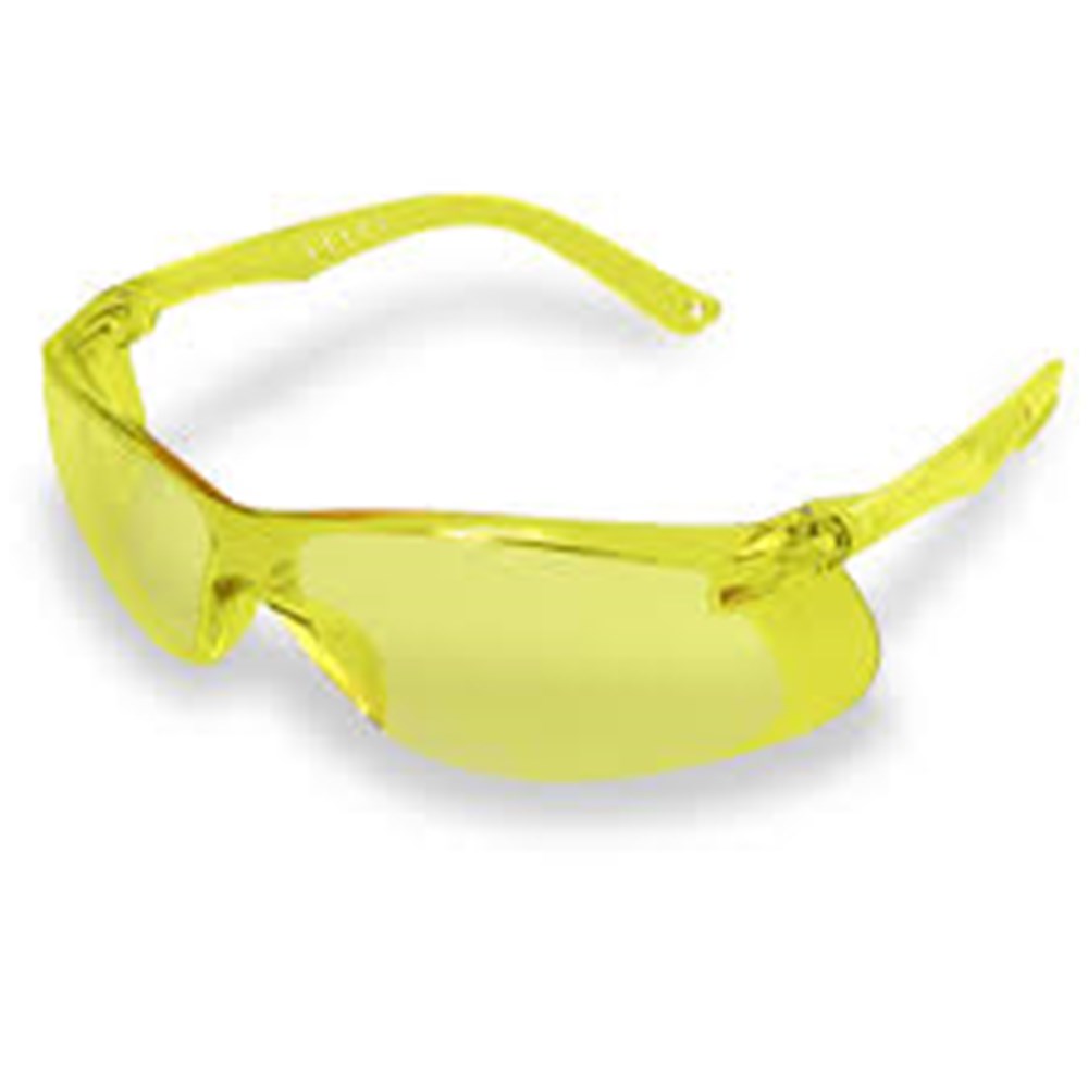 Óculos de proteção, com armação e visor confeccionados em uma única peça de policarbonato, com apoio nasal injetado no mesmo material, hastes tipo espátula confeccionadas do mesmo material do visor articuladas na armação por parafusos metálicos.